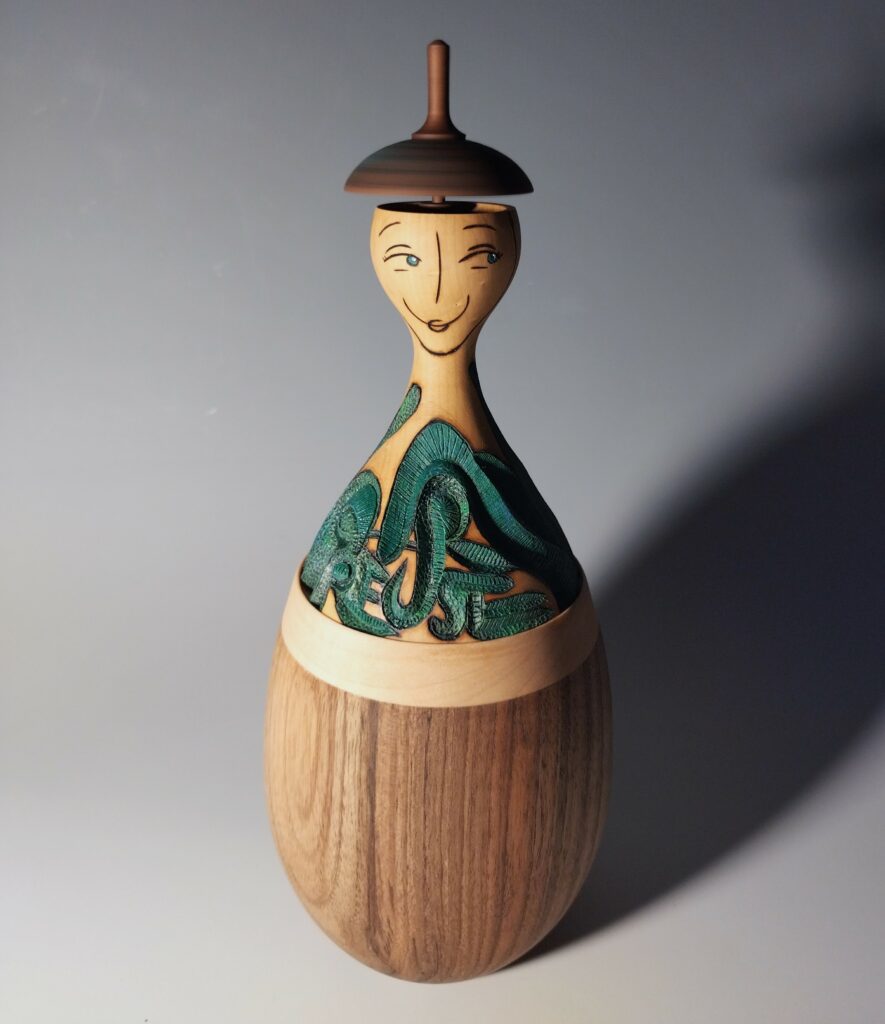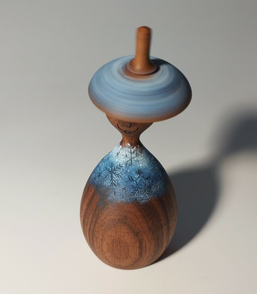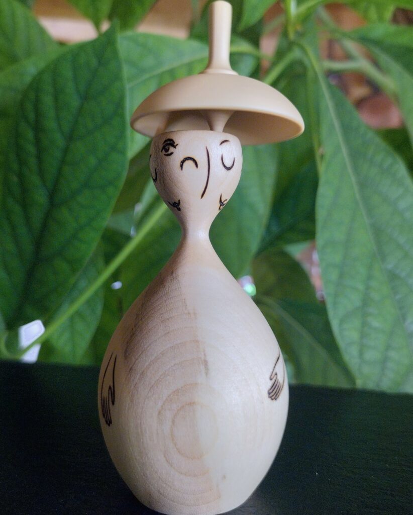 J’ai tourné ma première toupie dame en avril 2022. Il existe des toupies dames en bois brut, peintes, pyrogravées, sculptées. Certaines rendent hommages à des personnes, leurs valeurs. Les toupies dames deviennent alors porteuses de messages. Chaque dame est unique et signée.